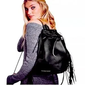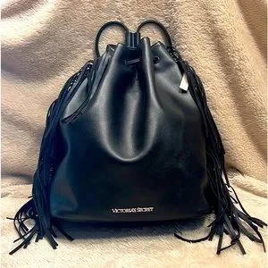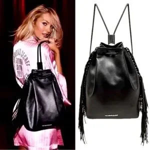 NWT VICTORIA’S SECRET VS LIMITED EDITION Runway Black Faux Leather Fringe Backpack. Versatile for either a western or boho look! Soft faux leather body. Black lined and free of compartments interior. Drawstring closure. Fringe details on both sides of the bag, VS silver tone metal logo. Measurements laying flat (approximately): please see pictures in listing. Gift(s) included with purchase. Should you have any questions, please do not hesitate to ask. Thank you for visiting my closet. 💐