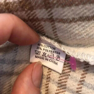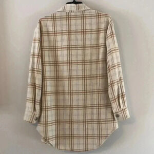 This is a heavy-flannel shirt/jacket. Looks great with leggings or jeans and provides a great amount of warmth when you want to forego the coat! Purchased from a local boutique, but can’t find the brand anywhere. Silver metal buttons add a nice accent! Measures 20” underarm to underarm; length is 34.5.”