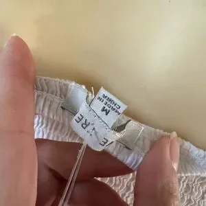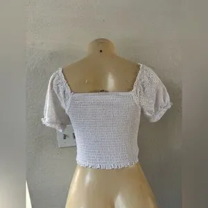 Elegant white crop top with smocked bodice. Features puff sleeves and eyelet details. Ideal for casual wear.