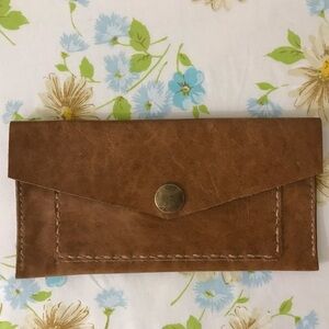 Handmade Genuine Leather Women’s Wallet Mini Purse. It can fit sunglasses, passport, small mirror, makeup, lipstick inside the compartment. 8 inches width 4 inches length. Handmade by me. Hand stitch. Made of 100% genuine pure leather.