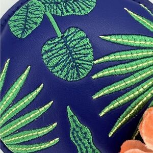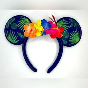 Colorful headband with tropical floral design and a butterfly. Features vibrant flowers and green leaves. Perfect for Disney fans.