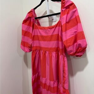 Peach Love California Bold Pink and Red Puffed Sleeve Striped Maxi Dress- Large