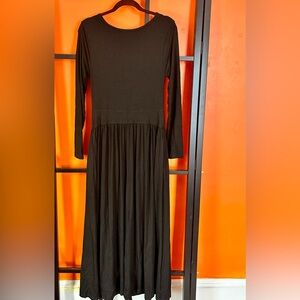 Timeless black maxi dress with a soft, stretchy feel and flattering flowy silhouette. Features long sleeves, a simple round neckline, and a gathered waist that creates beautiful movement through the skirt. Easy to dress up or down—perfect for everyday wear, travel, or layering year-round.