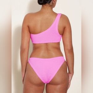 Hunza G's Nancy bikini set is a one-shoulder style that's handmade from the label's signature smoothing terry in bubblegum pink. Unlined. Cheeky coverage.