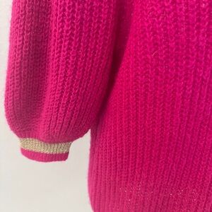Chic V-neck sweater with stylish puff sleeves. Bold pink color with elegant trim. Perfect for adding flair to your wardrobe.