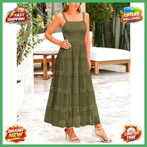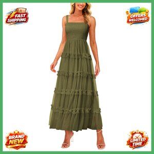 Sleeveless Smocked Tiered Ruffle Tulle A-Line Maxi Dress Boho Wedding Party