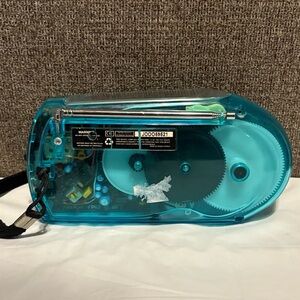 Translucent blue radio, we were able to get many channels in, works as it should - no flaws, foldable antenna, headphone jack, cranks to work, has carrying strap
