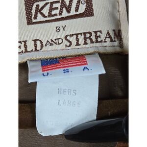 Vintage Field and Stream barn jacket for Kent features a durable poly-cotton shell with a warm quilted lining and 3M Thinsulate thermal insulation. This classic field coat is designed with a contrasting brown corduroy collar, a snap-front closure over a hidden zipper, and large front utility pockets. The interior includes a drawstring waist for an adjustable fit and an additional chest pocket. Made in the USA, this rugged yet stylish outerwear piece is perfect for outdoor activities or casual everyday wear in cooler weather.
