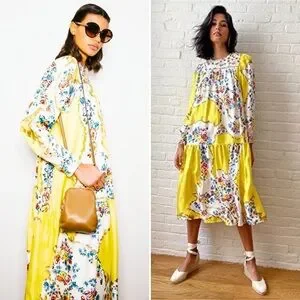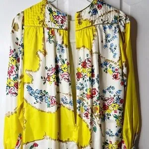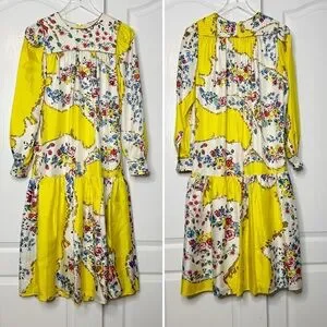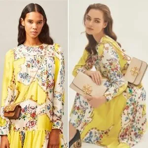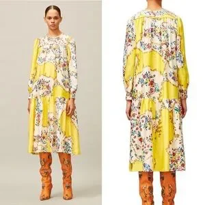 TORY BURCH Silk Quilted Yoke Yellow Floral Silk Midi Dress Size 4