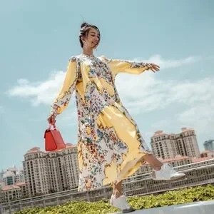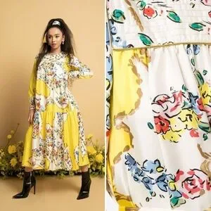 Empowering, Colorful, And Distinctly American Designs. Silk Quilted Yoke Midi Dress In Yellow Porcelain Floral With Quilted Accents, Gold Trim, Dual Side Seam Pockets.