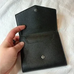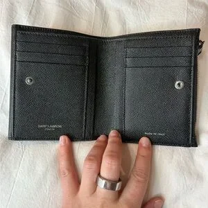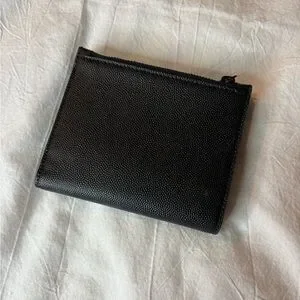 Chic black wallet by Saint Laurent. Textured finish with iconic logo detail. Compact and stylish.