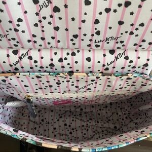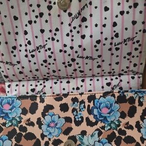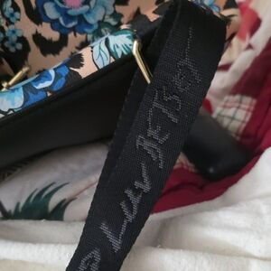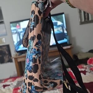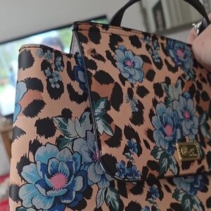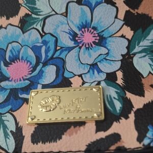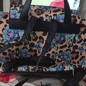 Stylish Betsey Johnson backpack. Features blue floral design on leopard print. Perfect for fashion-forward individuals.