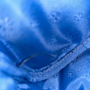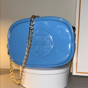 Tory Burch blue cosmetic bag with unbranded chain and logo detail. Perfect for travel or daily use.