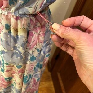 Embrace elegance with this floral spaghetti strap dress. Floral print with beautiful blend of pink and blue hues. The lightweight silk fabric and cotton lining ensures comfort and style. In great vintage co Siri on. There are belt loops by no tie belt, and some. Fraying on the inside hem.