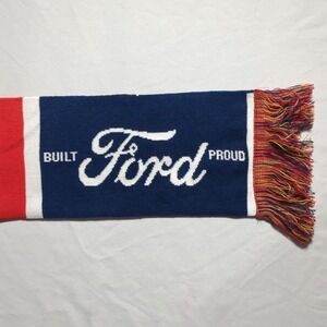 Florida Panthers NHL hockey scarf features a double-sided knit design with team logos and Built Ford Proud branding. This vibrant accessory showcases the iconic Panthers crest alongside bold Florida block lettering and Ford script logos. Constructed from a soft polyester knit, it includes classic multi-color fringe ends in red, navy, and gold. Perfect for game days at the arena or showing team spirit during the colder months.