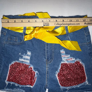 Girls L Distressed Sequin Denim Shorts Yellow Ribbon Belt Adjustable Waist Bling