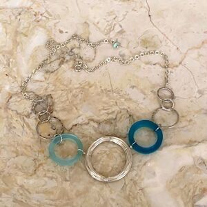 Brand new beautiful and unique handcrafted sterling silver necklace features two green glass circular links, six hammered circular links and a centre featuring sterling silver wire. The full length is 21” but it is completely adjustable to shorter lengths.