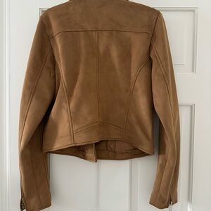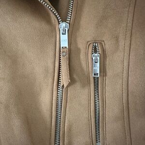 Stylish tan jacket. Features zip closure. Perfect for layering.