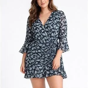 Style: Womens plus size silk chiffon faux wrap midi dress with ruched side