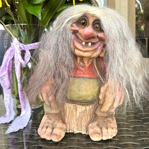 Happy Nyform troll sitting on a tree stump! This guy’s in beautiful condition with a gorgeous, full head of long, reindeer hair! He has his original Nyform booklet attached. He’s heavy and a statement piece.