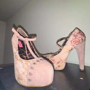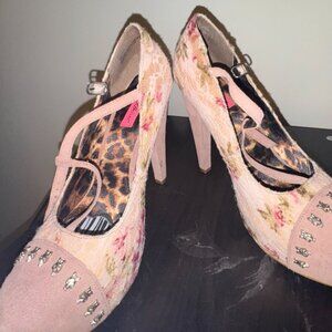Mortica brings you a fabric floral print upper with a feisty trim of metal skulls at the suede covered vamp. This t-strap Mary Jane style also features a 6 inch blush suede heel perfect for grabbing attention on the dance floor. Size 10