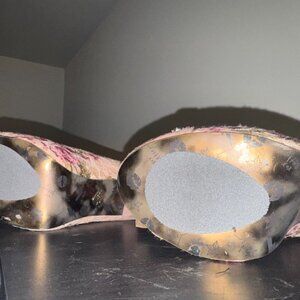 Missing one metal skull on left shoe as shown in pictures and the grippers on the ball of heel are still in place.