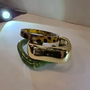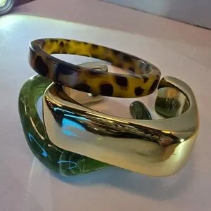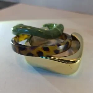 Bangle Bracelets are back and making a hot fashion statement, and these acrylic beauties are brilliantly shiny and new. This set of three pieces includes tortoise, gold, and green. The inside measurement is 2.65 inches with varying face widths. Wear them together or separately and create your own style. Next Day Shipping...NWOT