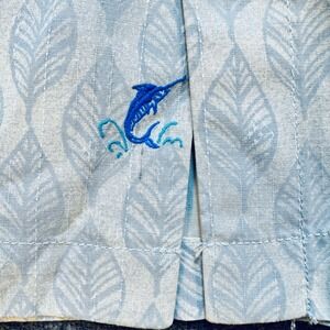 Elegant men's shirt with a vibrant print. This Tommy Bahama button-up features a captivating leaf and hibiscus pattern, adorned with an embroidered marlin logo near the hem. The shirt is made from substantial yet lightweight 100% silk, with short sleeves and a classic camp collar. Ideal for a resort vacation, beach outing, or casual summer gathering.