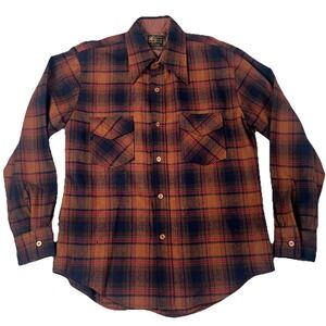 The product is a vintage men's wool flannel button-down shirt in size M. This shirt features a classic button-down collar, long sleeves, and a vibrant orange color. Made from wool flannel fabric, this shirt is perfect for a casual yet stylish look. The regular fit and quality materials make it a versatile and comfortable addition to any man's wardrobe. 0640