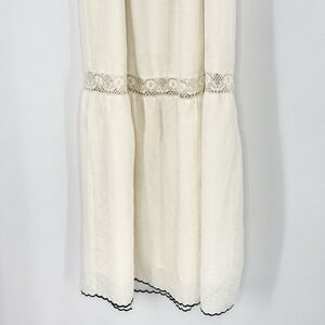 This Lulus flowy maxi dress features an elegant square neckline and back with adjustable tie-up shoulder straps, tiered A-line silhouette for beautiful movement. It features several tiers and horizontal inserts of crochet or eyelet lace detail along the skirt and bodice, adding a bohemian or coastal aesthetic. The hemline has a subtle, delicate black trim. Lightweight and airy gauzy fabric, slightly sheer.