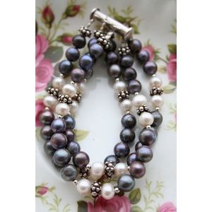 White and eggplant colored freshwater pearl three strand bracelet with silver spacers and tube closure. End to end lying flat 7.25”. Sterling silver to closure is 3/4” long