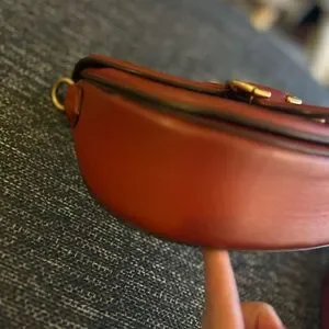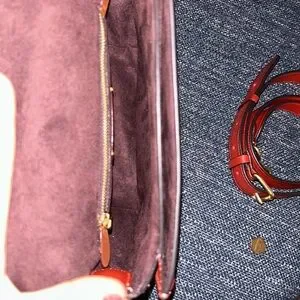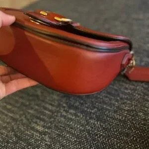 Elegant red crossbody bag with gold buckle. Stylish and versatile design. Perfect for any occasion.