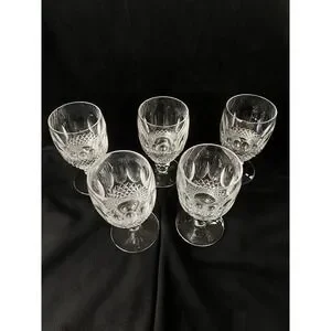 This is a set of five Waterford crystal Colleen claret wine stems. The stems are clear and made of glass and crystal. They stand 4 3/4 inches tall and have a round shape. The pattern on the stems is Colleen and they are original Waterford products. This set is perfect for all occasions and includes five pieces.