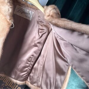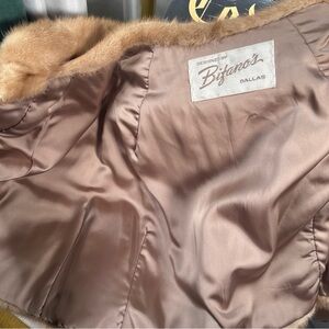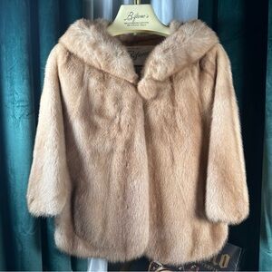 Beautiful vintage Bifano’s Dallas real mink jacket in dyed gold frost (gorgeous light beige/golden frost tone—pops in light!). Short/cropped hooded style with pom-pom details—cozy, chic, and perfect for winter layering.