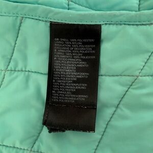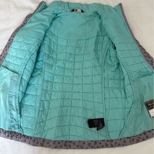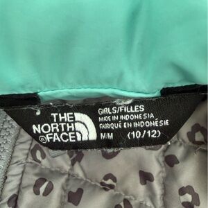 Chic jacket by The North Face. Girls size 10/12. Features a subtle gray pattern with teal accents. Perfect for stylish comfort. Normal signs of wear as shown in pictures.