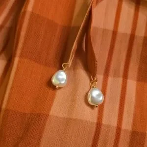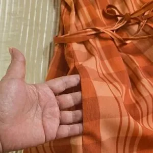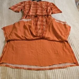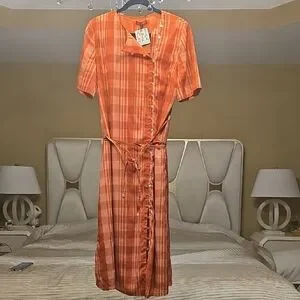 Chic orange checkered pattern. Button-up style with tie waist. Ideal for versatile wear. Gorgeous dress with a very beautiful design and details in the buttons and the lace with pearls on both ends. Two openings on the sides.