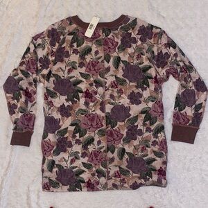 Elegant floral design with purple and brown hues. Comfortable long sleeves. Perfect for casual wear. Never worn. New with tags! Excellent condition! Pockets!