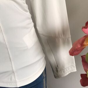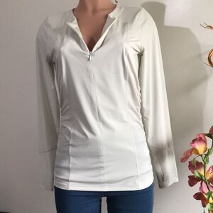Features: UPF 50, two-ply, clean-finish center-front panels with hidden half-zip closure; side spot ruching; long sleeves; hidden zip pocket on left sleeve seam, wicking properties
