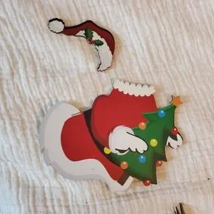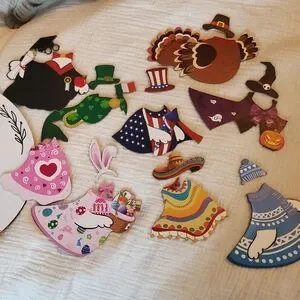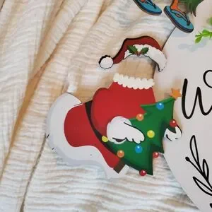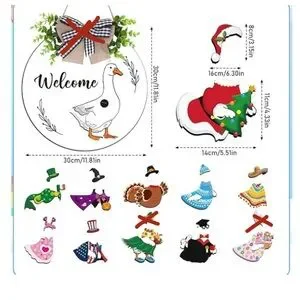 *PLEASE NOTE FLAWS AND MISSING PIECES.* Wooden round welcome sign featuring a goose with interchangeable occasion outfits. The sign is missing the burlap bow and some of the faux foliage from the top center. There are some dark scuff marks near the gooses head, above its back and along body, and on its neck.