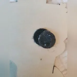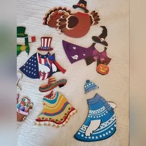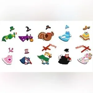 it is also missing the small magnet over the head to hold the headwear, and the piece of Velcro from the body portion to hold the outfits on. Two of the outfits are also missing their headpieces, the Hawaiian outfit and the Valentine’s Day outfit. One of the outfits has a glob of hot glue on the back of it.