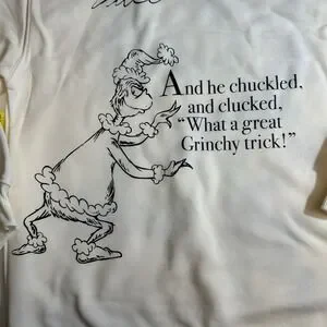 Dr. Seuss The Grinch Stole Christmas sweatshirt features iconic storybook illustrations and quotes on both the front and back. The cream-colored fleece-lined pullover includes graphics of the Grinch in his Santa outfit, Max the dog, and Whoville, accompanied by the classic "wonderful, awful idea" and "Grinchy trick" text. This officially licensed piece is finished with a ribbed crew neck, cuffs, and hem for a comfortable fit.