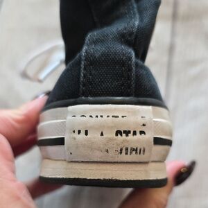 Classic Converse high-tops for kids. Black canvas with white accents. Comfortable and stylish for everyday adventures. Worn but still pretty good condition.