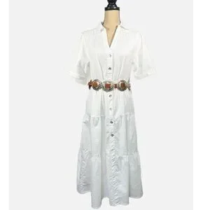Worn once, possibly two times. Great preowned condition. Button down front, tiered ruffles. Thicker fabric, tag says polyester but actually feels more like cotton to me. Super cute if paired with matching belt, bag, and heels.