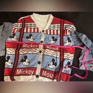 Colorful cardigan featuring Mickey Mouse design. Red, blue, and white pattern with button closure.