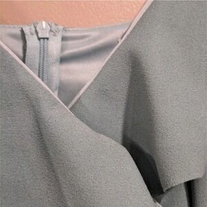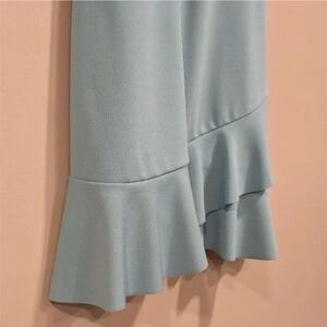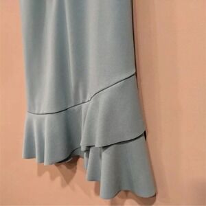 Adjustable spaghetti strap v neck with ruffled neckline and hem, back zipper closure, a few small fabric imperfections as shown in photos