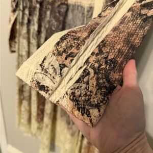Step into sophistication with this elegant long sleeve crochet and lace sweater. Crafted in neutral tones, it offers a timeless look for any occasion. The delicate lace and flowing design ensure a flattering fit. Excellent condition, no flaws noted