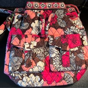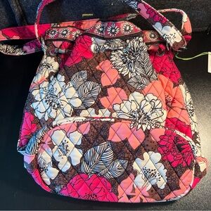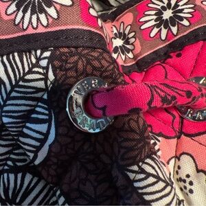 The Very Bradley NWT Quick Draw Bag in Mocha Rouge is a medium-sized bag with a floral pattern and a multicolor exterior. It features a cinch, magnetic, and zipper closure, as well as silver hardware. The bag has a pink, brown, and white handle/strap, and is made of cotton with a pink, white and brown lining. This designer bag from Vera Bradley combines style and functionality, making it a versatile accessory for women who appreciate both fashion and quality.