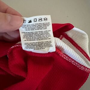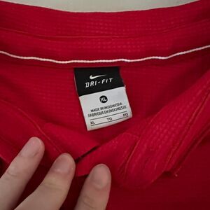 - Nike Dri-Fit polo. Waffle knit. Features three buttons. Red collar. With white blocking down sides and on collar bone. White Nike swoosh on right chest. In great condition.