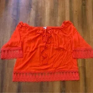 CATO NWT top Medium Poinciana Orange Crocheted trim sleeves bottom off shoulder