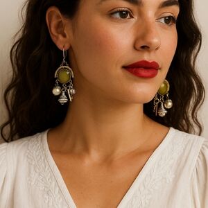 These statement earrings from CAbi feature a chic vintage-inspired design with a mix of gold and silver tones. Each earring includes a faceted yellow resin center framed in ornate gold detail and dangling charms—keys, filigree spheres, acorn-style caps, and faux pearls—for a playful, eclectic look.